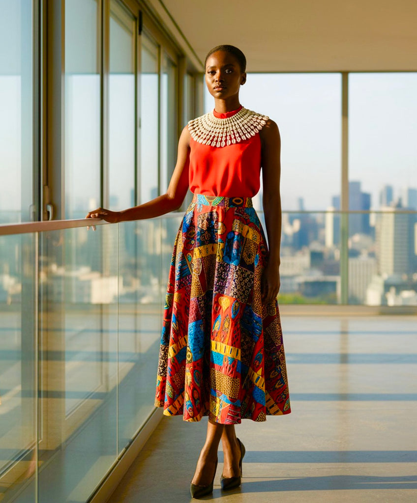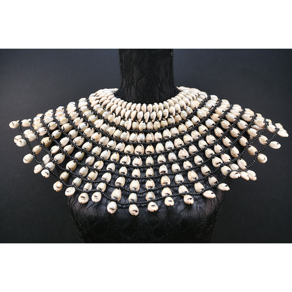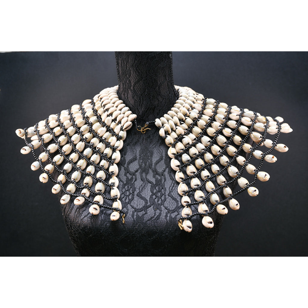 Historically cowries have deep cultural significance in many West African societies but has now evolved as a fashion styling accessory. The bib statement necklace is a stunning statement piece that can be styled in numerous ways to elevate your look. The sculptured silhouette with it exquisite layered cowrie shells looks luxurious as a finishing piece and immediately makes impact. It looks gorgeous again solid colour attire, taking a simple piece to another level of effortless style. This would also look fabulous when styled with Ankara, kente inspired pieces or mud cloth to give that cultural look. Style with a simple tee and jeans or pants. The possibilities are endless.