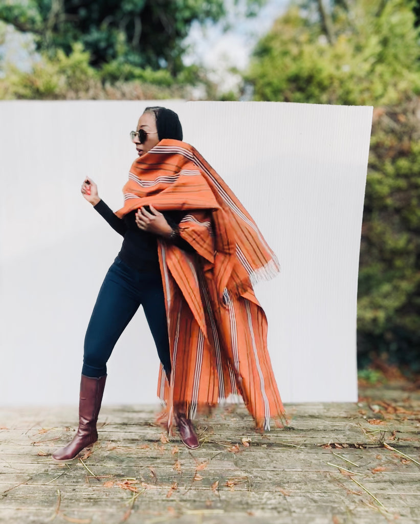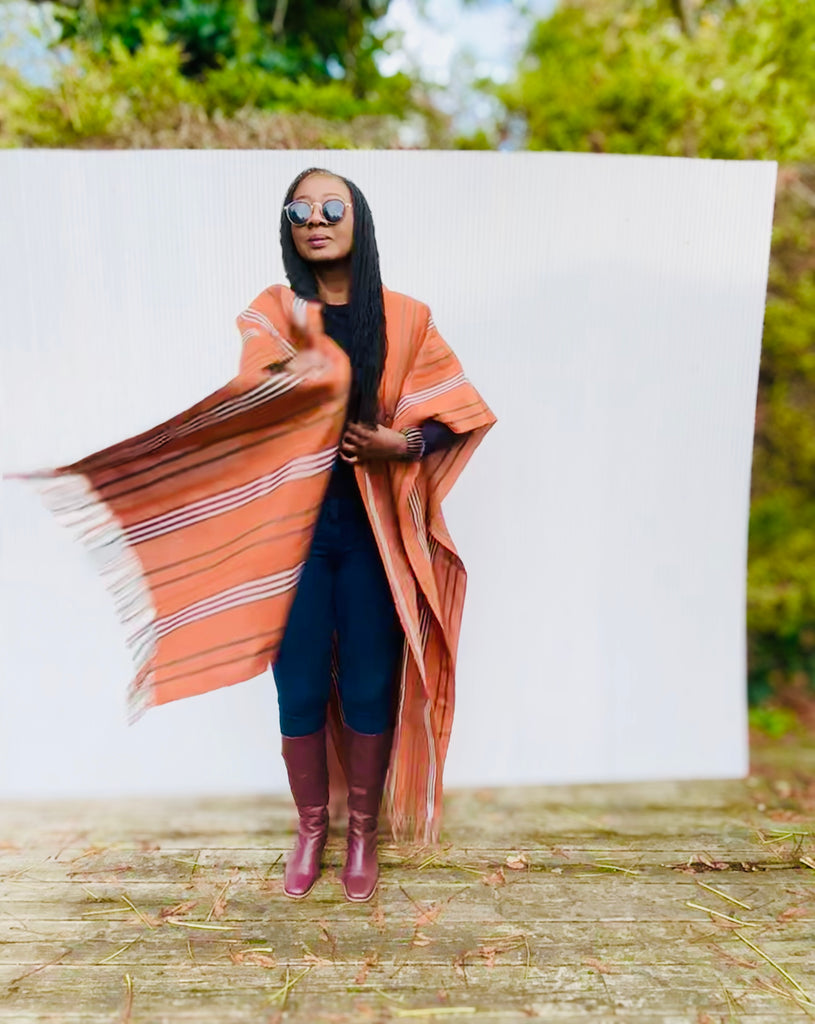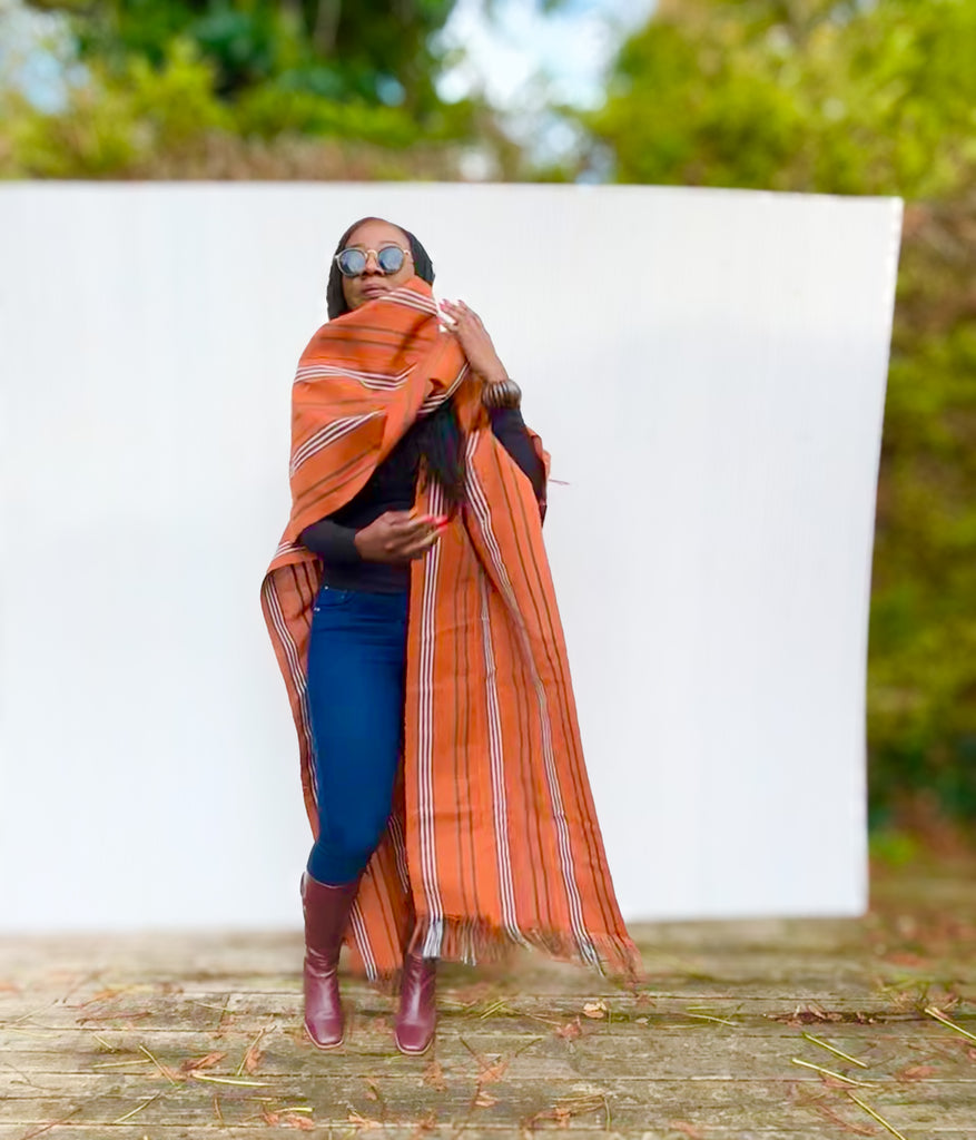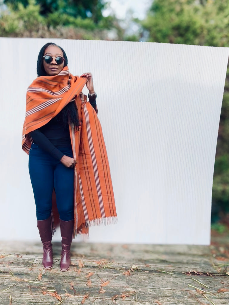 Our Aso Oke luxurious kimono offers a stylish alternative to outerwear on cool days. Drape it over your shoulders and leave open or drape and wrap round your neck like a shawl. It looks great over a fitted tee or turtle neck and jeans or trousers. For a sleek look belt it and adjust the kimono to whatever style you wish.