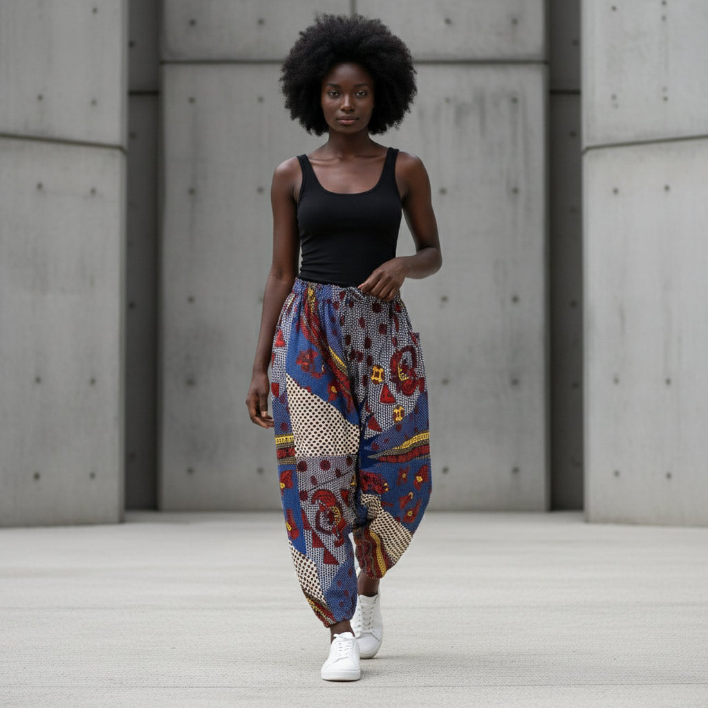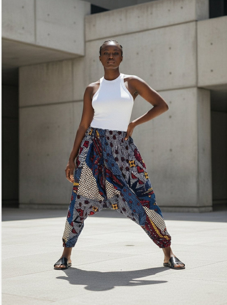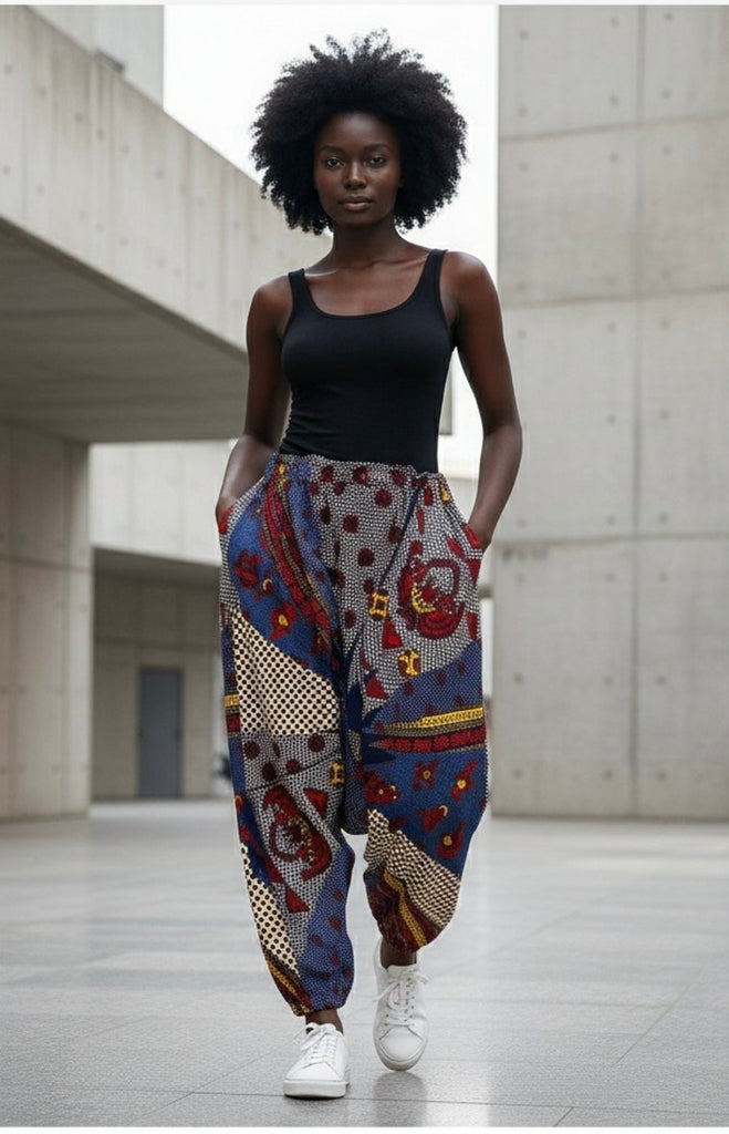 Our free size Harem pants in a gorgeous multi pattern African print is fun, comfortable, airy, relaxed and stylish. It’s a versatile piece that can be styled your way and depending on the occasion. For a smart casual look, pair with a tank top, a close fitted shirt tucked in and trainers or sandals. On cooler days wear a turtle neck throw on a denim jacket or a cropped leather jacket and if chilly just throw on a coat and scarf. Wear with trainers, combat boots or ankle boots and add some accessories.